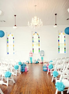 For something unique, find different shaped bird cages at your local pet store or garage sale, and paint them in your own theme colours (I adore the pink and blues one's in the photos below, they're so fun). Or why not create a bird cage chandelier and hang them from the ceiling for a real talking piece... no ruffled feathers here.